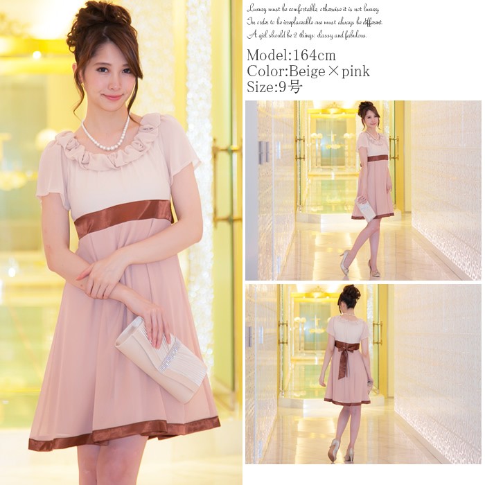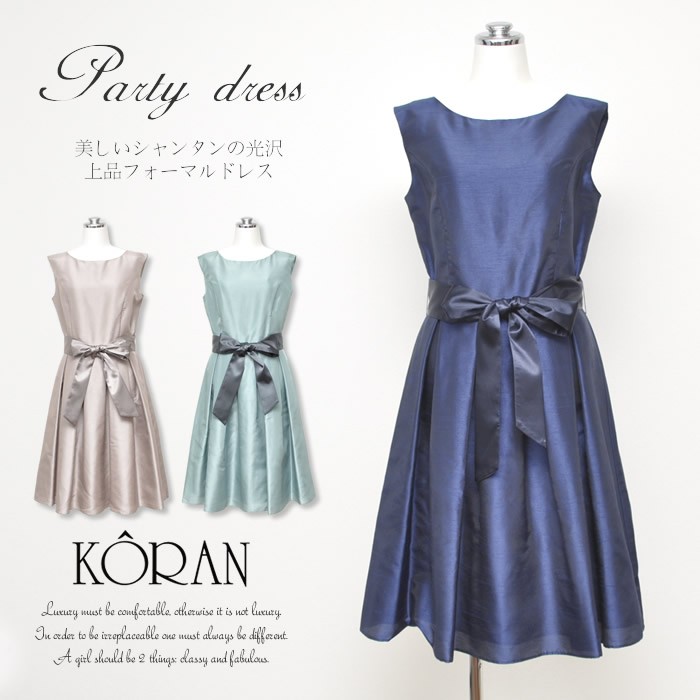 高感度なガーリースタイル パーティドレス:7,992円 カラー:ライトブラウン/ミント/ネイビー サイズ:M・L シャンタンの中でも質の高い滑らかな光沢感を持つ生地を使いました ウエストベルトリボンに腰切り替えのふんわりタックが可愛い印象に スカート丈をほんの少し長めにすることで大人っぽさもプラス 甘めなディテールに、しっかりとした素材やシルエットで華やかな席を飾ります