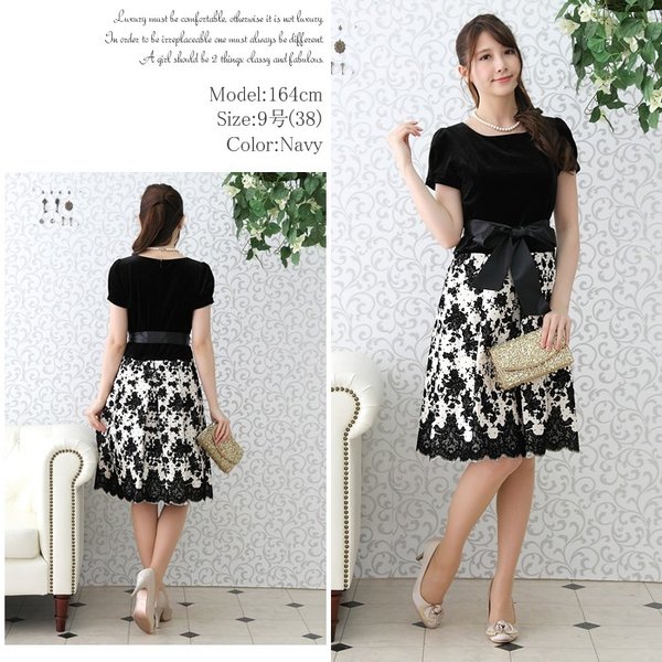 JUGEMテーマ:パーティ 結婚式などの華やぐお呼ばれの席を美しく飾る上品なフォーマルワンピース https://item.rakuten.co.jp/koran/ko20-5-3550/ 色:クリーム/ネイビー サイズ:9・11・13・15号 価格:20,520円 滑らかな光沢を持ち綺麗な起毛が目を惹くベロア素材が贅沢な質感 パーティー生地の定番であるシャンタンの上には細かい花柄フロッキーを装飾したAラインスカート 異素材を絶妙なバランスで組み合わせが、いつまでも美しい女性らしさを引き立たせてくれます
