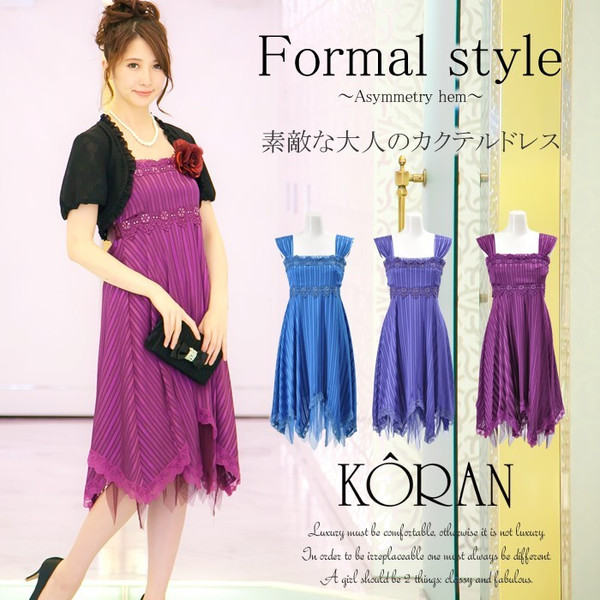 JUGEMテーマ:パーティ 華やかなシーンを飾る大人のカクテルドレスがお買い得!! 色:ラベンダー/ブルー サイズ:M・L・LL 価格:7,900円 光沢感のあるスリット色を織り込んだシャドーストライプ柄の生地が目を引くセミロング丈のパーティードレス ハイウエストなデザインで足長効果が期待できます アシメントリーな裾が、立っていても座っていても綺麗シルエットをキープ スタイルがよく見えると好評のフォーマルドレスです 結婚式や披露宴、二次会等のパーティーシーンにオススメのドレス