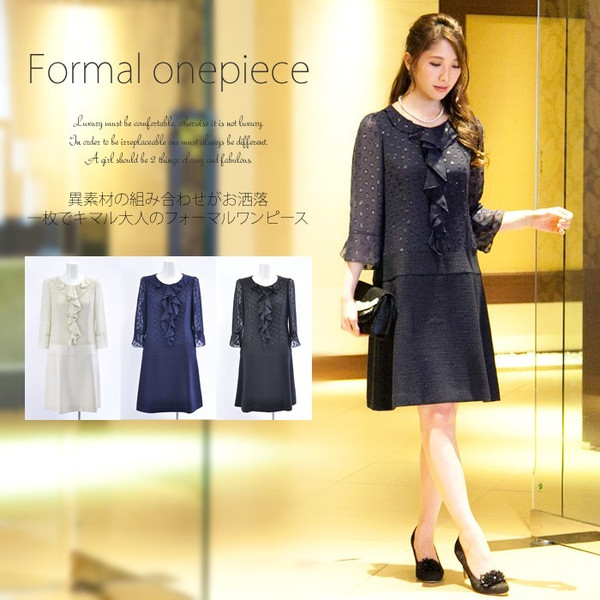JUGEMテーマ:パーティ ☆華やぐ席には上品フェミニンな大人ワンピースで。 https://store.shopping.yahoo.co.jp/koran/ko32-d501040.html 色:ベージュ/ネイビー/ブラック サイズ:9・11・13号 価格:21,384円 フェミニンな印象の可愛いフォーマルワンピース 上下を異素材を使った一枚着ワンピースは セットアップのようなもたつきがなく、ジャケットと合わせても すっきりとしたシルエットになります。 上身頃は前立てフリルやオパール加工で上品なデザインに スカート部分はラメ糸を織り込んだ【...