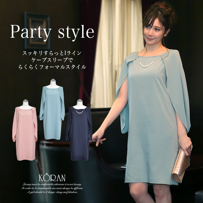 JUGEMテーマ:パーティ ケープスリーブでスッキリIラインの美人スタイル 色:ピンク/ミント/ネイビー サイズ:M 縦に長いラインを強調するIラインシルエットは 全体的にぽっちゃりでお悩みの女性にオススメのパーティードレス また縦ラインを強調するデザインは背の低い女性にもオススメ 肩から二の腕まわりをカバーする袖は上品さを演出しボレロ要らず 結婚式や華やかな席など幅広いシーンが一枚でキマる便利なアイテム