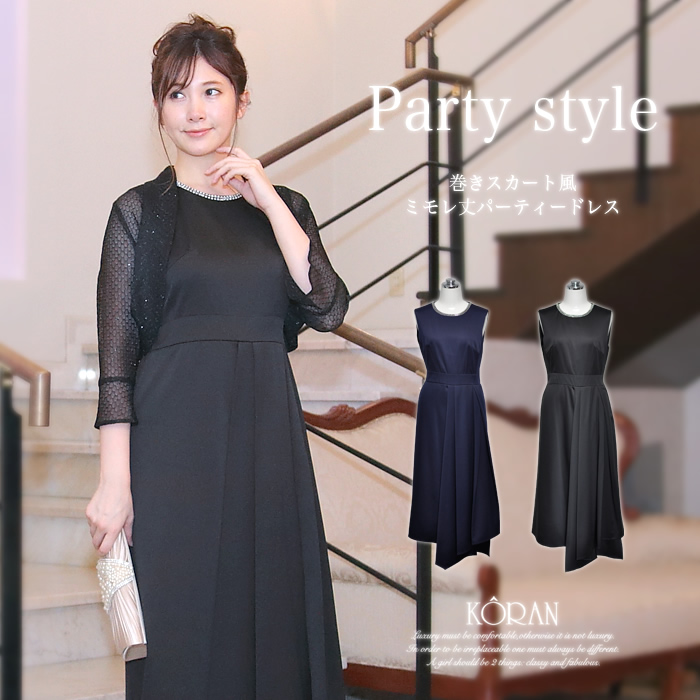 縦ラインをキレイに。ミモレ丈の上品パーティードレス。 JUGEMテーマ:パーティ 色:ネイビー/ブラック サイズ:M 丁寧にタックを寄せたラップアラウンドスカートは 前を長く流して縦ラインを綺麗見せ しっとりと厚みのある生地は落ち着いた上品な光沢感 ダイヤレーンは黒とクリアの二色使いで顔回りを華やかに演出 バックはゴム入りで体型にしっかりフィット 安心の膝下丈でドレススタイルもステップアップ シンプルなノースリーブでボレロもショールもコーディネート自由自在