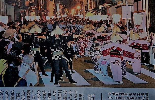 JUGEMテーマ:日々を楽しく 9月1日から3日間は、越中八尾おわら風の盆である。猛暑の年や雨風のこともあるが、今年は幸い良い天気に恵まれた。 立春から210日前後のこの頃は台風が多く、稲が風水害にあわないようにとの願いが込められているという。もっとも昨今は、稲の刈り取りは大方終わってはいるが。 伝統的な祭りとしては北陸最大級のものである。1日に約10万人が見物に訪れるという。八尾ではこの時期だけ民家を宿泊場所としているが、この近くどころか富山県内では観光客を...