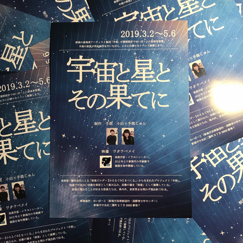 4/28(土)13:00-16:00 ゆいぽーとにて公開制作をやります! オドルフクでも大変お世話になりました 手部(てぶ)代表のじゅんさんからお誘い受けまして素敵な機会を頂きました。 是非この機会にゆいぽーとへ遊びに来てください* 詳細は下記に記載されています。 【 宇宙と星とその果てに 】 新潟の表現者アーティスト集団「手部」が期間限定でゆいぽーとに部室を...