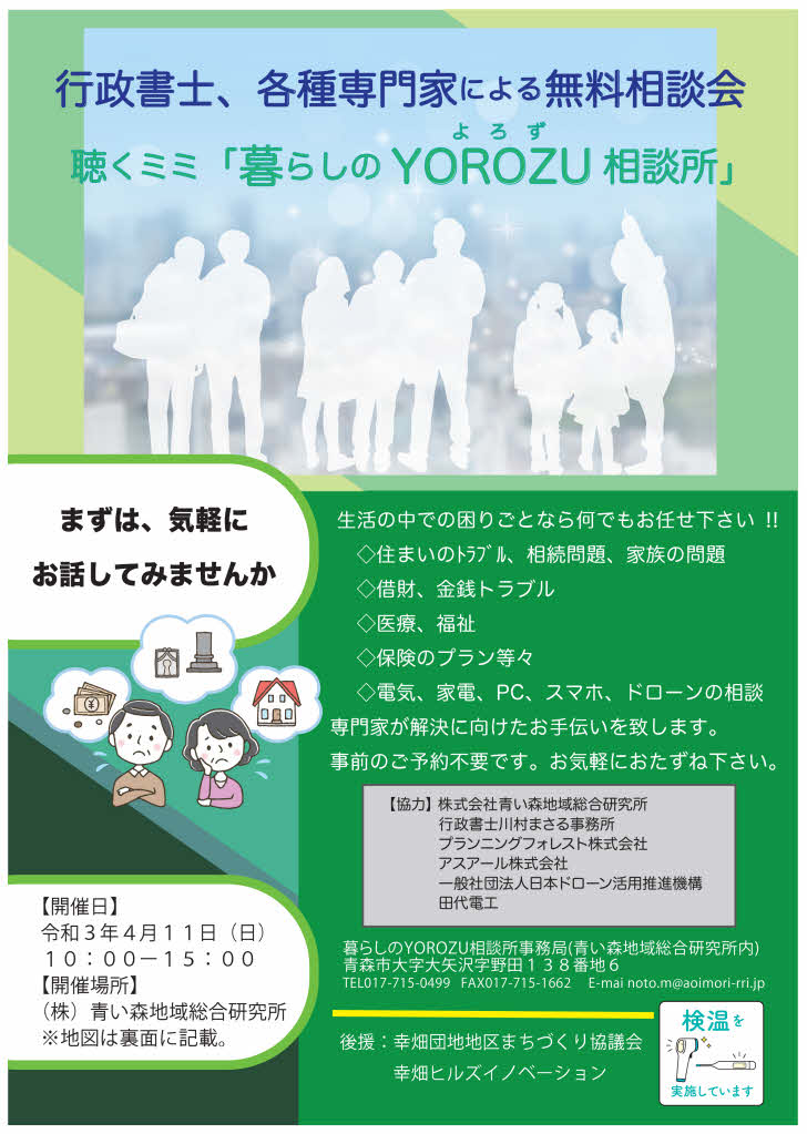 JUGEMテーマ:イベント情報 行政書士、各種専門家による無料相談会開催! 当事務所など関係先は、イベントを開催します。 令和3年4月11日(日) 午前10時から午後3時まで ◇住まいのトラブル、相続問題、家族の問題 ◇借財、金銭トラブル ◇医療、福祉 ◇保険のプラン等々 ◇電気、家電、PC、スマホ、ドローンの相談 専門家が解決に向けたお手伝いを致します。 事前のご予約不要です。 お気軽におたずね下さい。 場所:青森市大字大矢沢字野田138番地6 (当事...