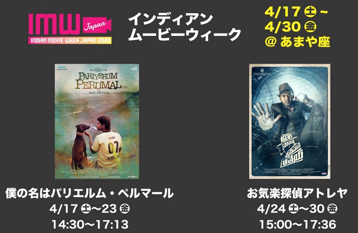 またまた お知らせ が 遅れました(>_<人) インディアンムービーウィーク 2020 追加 開催 の お知らせです ! ( HP ・ ツイート ) 4月17日(土)より 2作品 ★★★ 場所は 茨城県 那珂市 あまや座 です。 ★★★ ★『 僕の名はパリエルム・ペルマール 』 4月 17日(土)〜23 日(金) 14:30 〜 17:13 ★『 お気楽探偵アトレヤ 』 4月24日(土)〜30日(金) 15:00 〜 17:36 インド文化研究家 山田桂子先生 と ラジオパーソナリティな...