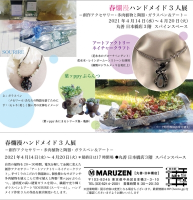 こんばんは 最近は、ブログよりもTwitterやインスタ投稿が多くなって、すっかりご無沙汰しておりますが みなみなさま、お変わりございませんでしょうか? こんな御時世で。。。。といいつつ、1年が過ぎましたが 葉ッppyは粛々と活動しておりまする^^ なかなかご案内までいきませんが、近況報告です *2021.4.14(水)〜20(火)9:30〜20:30(最終日〜17:00) ...