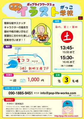 pop-life-works、2月の予定です。 ■イラスト教室 開催日:2/13、2/27 (13:45〜/15:30〜) ※換気の上、授業を行っていますので、暖かい格好でお越しください ※天候や感染状況により、中止になる場合があります。その場合、受講生に直接ご連絡致します。 ※新規の受講は現在、受け付けていません。ご了承ください。 ・群馬県館林市「たたらイラストがっこ」 ※既存の生徒のみの受講となります。 ...