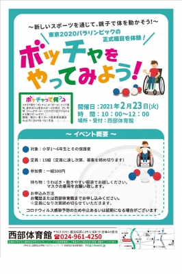 JUGEMテーマ:イベント情報 「主催事業 ボッチャをやってみよう」参加者募集! 西部体育館です。 パラリンピックの正式種目の「ボッチャ」を体験してみませんか。 開催日:2月23日(火・祝日)10:00〜12:00 場所 :西部体育館(郡山市大槻町字漆棒48) 対象 :小学1〜6年生とその保護者 定員 :15組(定員に達し次第、募集を締め切ります) 参加費:一組500円 申込み:お電話又は直接お申込み下さい お気軽にお電話く...