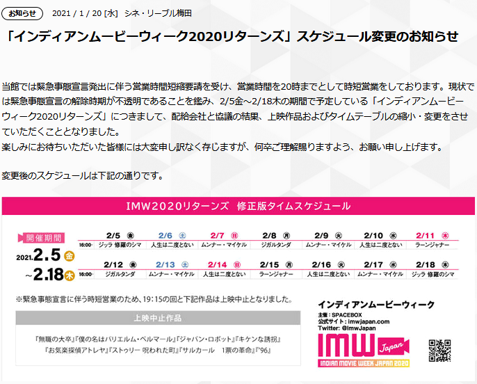 インディアンムービーウィーク 2020 リターンズ 追加開催 の お知らせです ! ( HP ・ ツイート ) 2月5日(金)より ★★★ 場所は シネ・リーブル梅田 です。 ★★★ ヒンディー、タミル 以外も 楽しめます。 ========= 28日追記: 緊急事態宣言により、時短営業、一部 上映中止になりました ( シネ・リーブル梅田 ) ========= ========================== JUGEMテーマ:映画