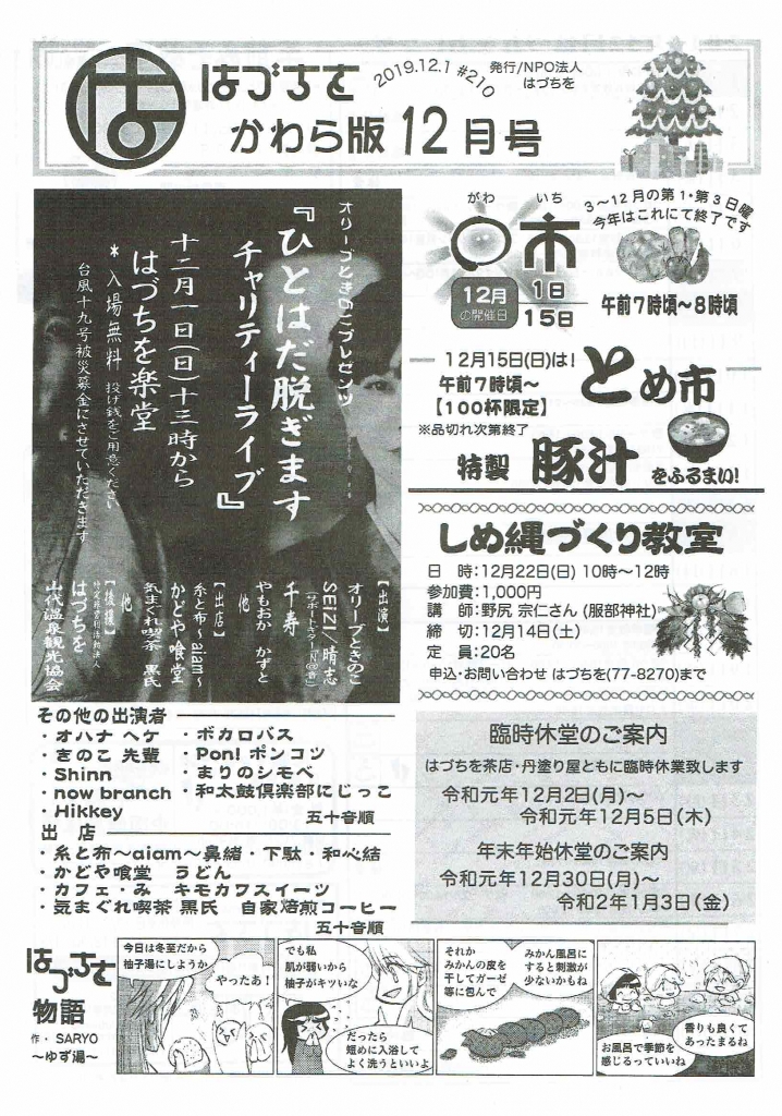 はづちを12月号 JUGEMテーマ:イベント情報 ○市(がわいち)12月1日・15日 (午前7時から8時) 15日は、とめ市特製豚汁をふるまい! 12月1日13時から 「ひとはだ脱ぎますチャリティーライブ」 入場無料(投げ銭ライブ・台風19号義援金にいたします) しめ縄づくり教室 12月22日10時から12時 詳細はホームページへ http://www.hadutiwo.com/