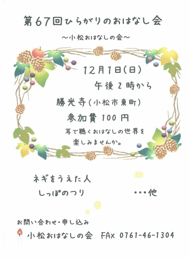 JUGEMテーマ:イベント情報 小松おはなしの会 第67回ひらがりのおはなし会 日時 12月1日(日)午後2時〜 会場 勝光寺(小松市東町) 参加費 100円 耳で聴くおはなしの世界を楽しみませんか?
