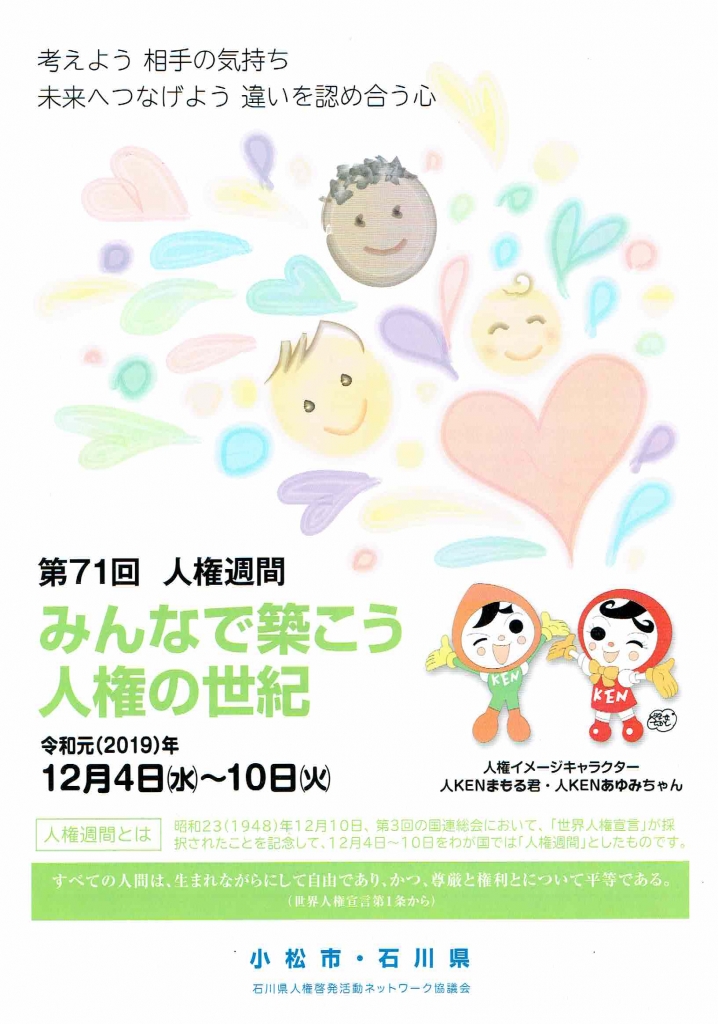 JUGEMテーマ:イベント情報 第71回人権週間 みんなで築こう人権の世紀 令和元年 12月4日〜10日 法務省 人権週間ホームページ http://www.moj.go.jp/JINKEN/jinken03.html