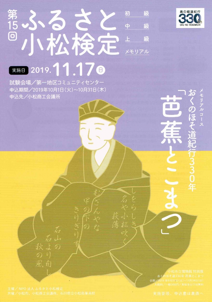 JUGEMテーマ:イベント情報 「ふるさと小松検定」とは 「ふるさと小松検定」の目的は、ふるさとへの理解を深めることと、 より多くの皆さんに小松の魅力を 知っていただくことです。 この検定を通して、ふるさと小松が好きになり、 ここで生活していることに 誇りと自信を持ってくださる方が増えれば、大変うれしく思います。 小松市の記念事業にあわせたメモリアルコースの 今年のテーマは、松尾 芭蕉が「おくのほそ道」 の道 中で、小松に訪れてから330年を記念して、 おくのほそ道紀...