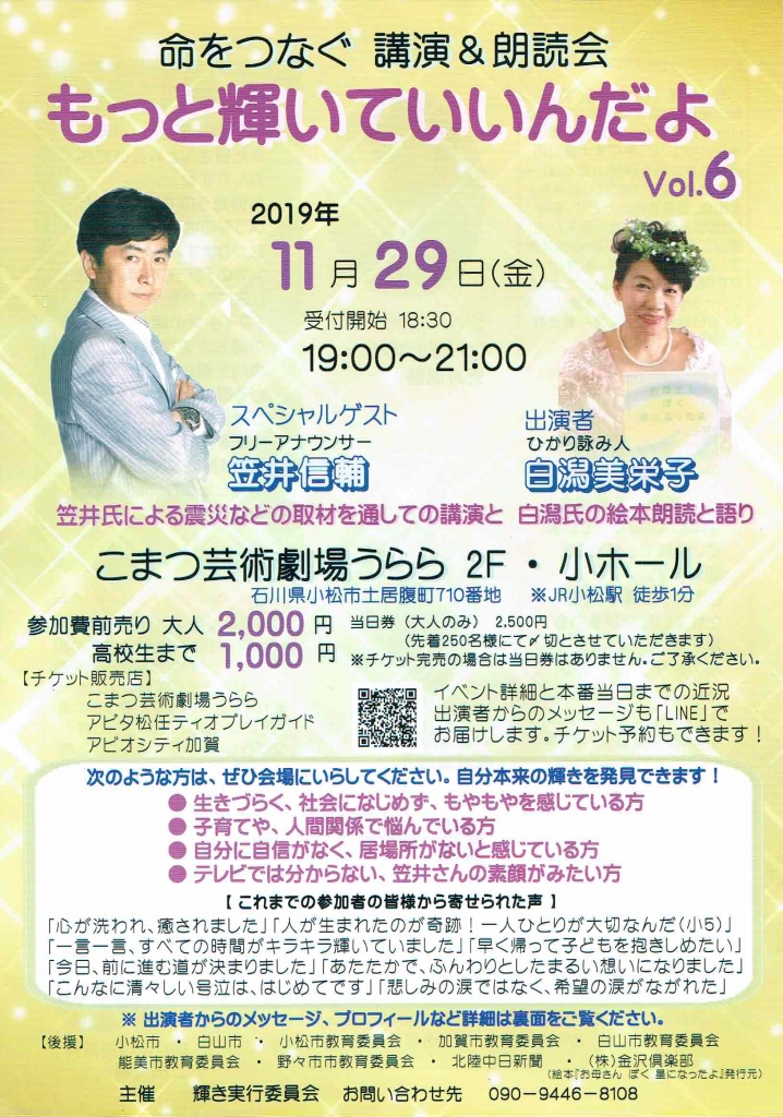 JUGEMテーマ:イベント情報 石川県での開催は、今年で6年目になります。 命をつなぐ、講演と朗読会です。 フリーアナウンサー 笠井信輔氏が、東日本大震災直後に被災地を取材された時の貴重な体験談の講演です。 朗読は、白山市在住の白潟美栄子氏の絵本朗読と語り、笠井信輔氏の絵本朗読。 そして、出演者二人のほのぼのトークなど、お楽しみ満載のイベントです。 ************************ ● 2019年11月29日(金) 会場:こまつ芸術劇場うらら2階 ・ 小ホール 小松市土居腹...
