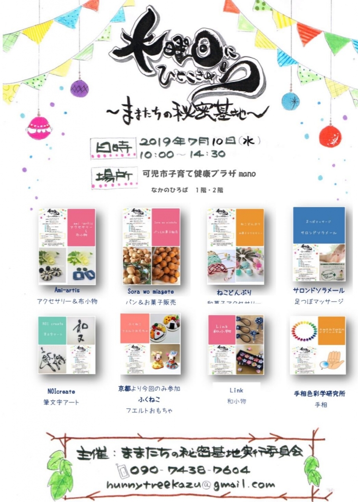 JUGEMテーマ:イベント情報 手相色彩学研究所®は、ブログランキングに参加しています。 手相ランキング 一日一回、クリックして頂けると、励みになります 宜しくお願い致します。 手相の専門家の日比野かずほです。 今日は、イベントのお知らせと、出店者様のご紹介です。 「水曜日にひとこきゅう〜ままたちの秘密基地〜」 次回予定日:7月10日・9月11日・10月9日 11月13日・12月11日・2月12日・3月11日  ...