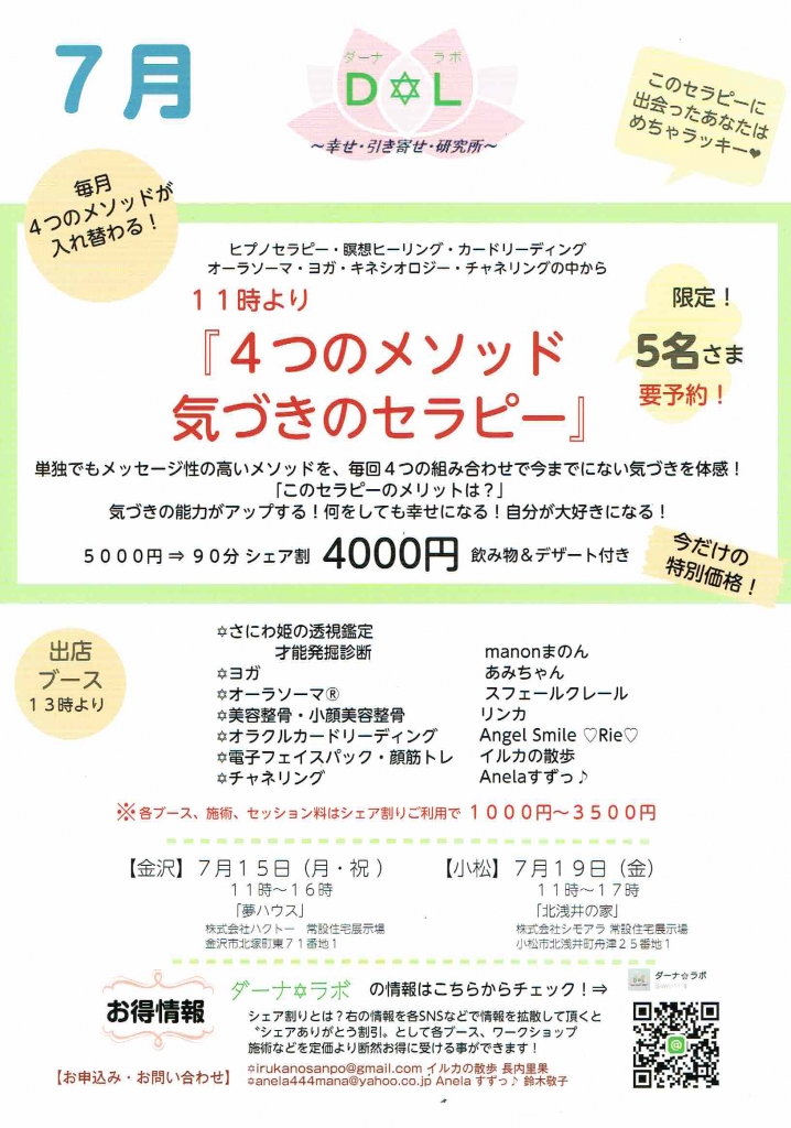 JUGEMテーマ:イベント情報 ダーナ★ラボ 7月 「4つのメソッド 気づきのセラピー」 金沢会場 7月15日 11時〜16時 夢ハウス(金沢市北塚町東71番地1) 小松会場 7月19日 11時〜17時 北浅井の家(小松市北浅井町舟津25番地1)