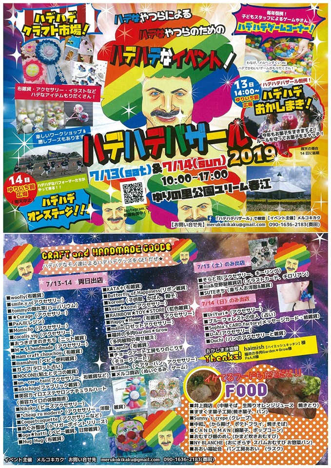 お待たせしました。 今年も『ハデハデバザール』開催されます。 7月13日(土)と14日(日) 10:00 〜 17:00 ゆりの里公園ユリーム春江 お待ちしています!!