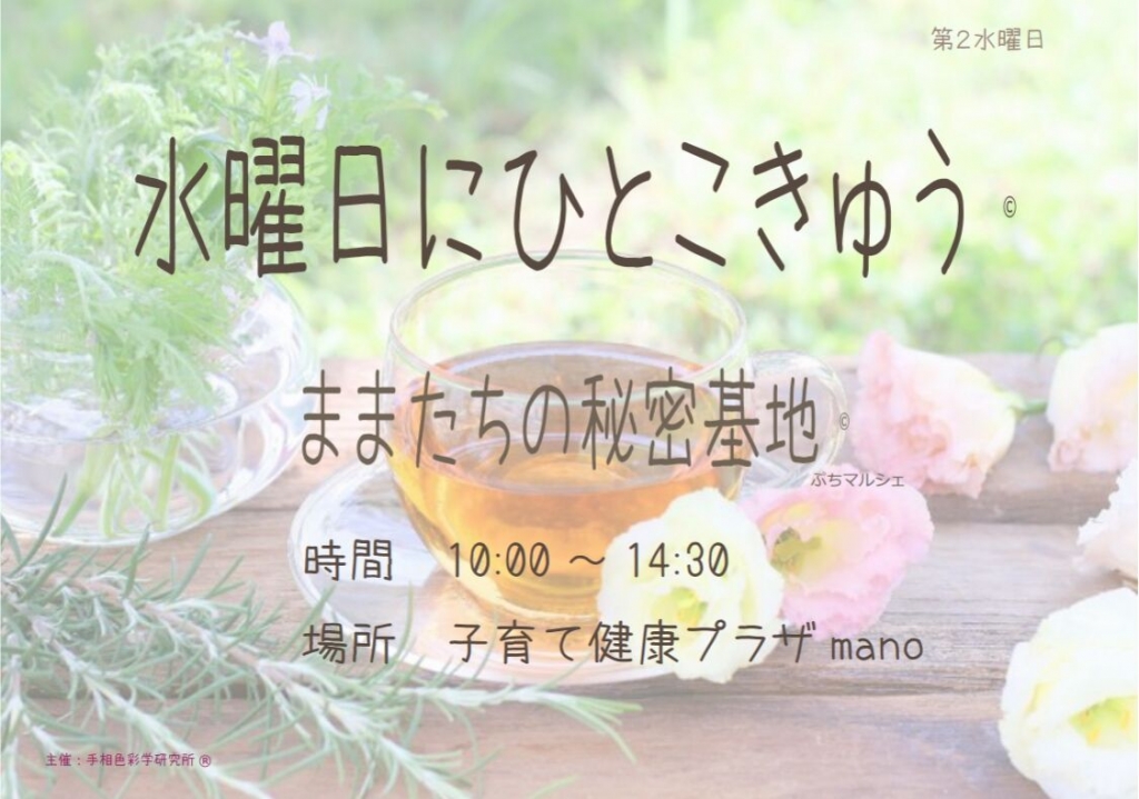 JUGEMテーマ:イベント情報 V・出版の準備中! 手相色彩学研究所®は、ブログランキングに参加しています。 手相ランキング 一日一回、クリックして頂けると、励みになります 宜しくお願い致します。 手相の専門家の日比野かずほです。 今日は、イベントのお知らせと、出店者様の募集です。 「水曜日にひとこきゅう〜ままたちの秘密基地〜」 予定日:6月12日・7月10日・9月11日・10月9日 ...