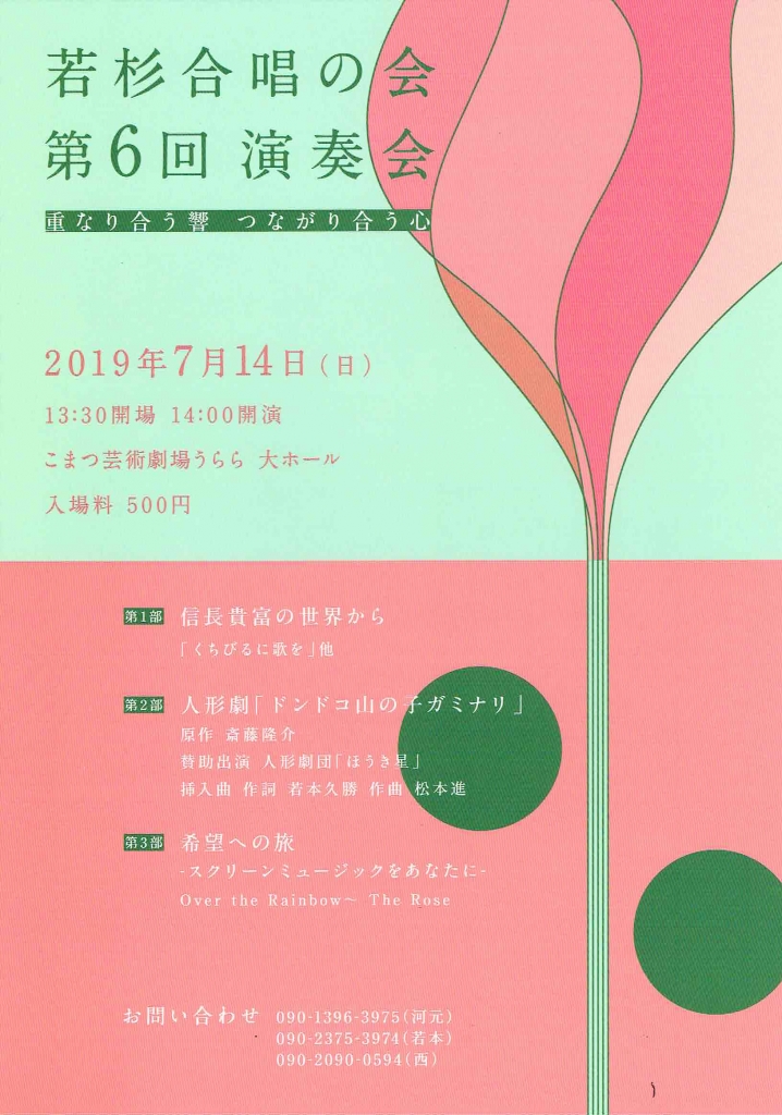 JUGEMテーマ:イベント情報 若杉合唱の会 第6回演奏会 「重なり合う響き、つながり合う心」 2019年7月14日 13時30分開場 14時開演 こまつ芸術劇場うらら 大ホール 入場料 500円