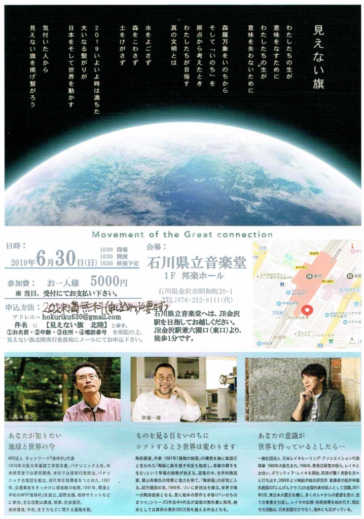 JUGEMテーマ:イベント情報 わたしたちの生が 意味をなすために わたしたちの生が 意味を失わないために 森羅万象をいのちから そして「いのち」を 原点から考えたとき わたしたちが目指す 真の文明とは 水をよごさず 森をこわさず 土をけがさず 2019いよいよ時は満ちた 大いなる繋がりが 日本をそして世界を動かす 気付いた人から 見えない旗を掲げ繋がろう 2019年6月30日 10時開場 10時半開演 16時終演...