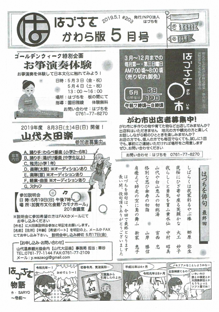 JUGEMテーマ:イベント情報 はづちを 〇市(がわいち) 5月は5日・19日 午前7時から 山代大田楽 8月3日、4日 開催! 参加者募集中 はづちをホームページ http://www.hadutiwo.com/