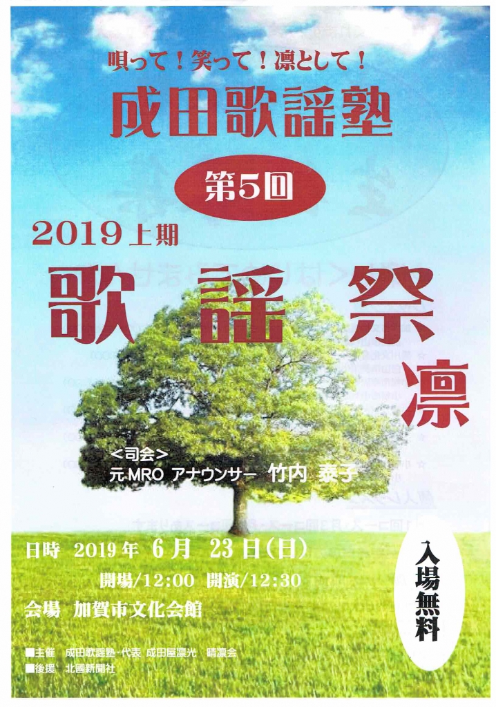 JUGEMテーマ:イベント情報 成田歌謡塾 第5回歌謡祭 凛 6月23日(日) 開場/12:00 開演/12:30 会場 加賀市文化会館
