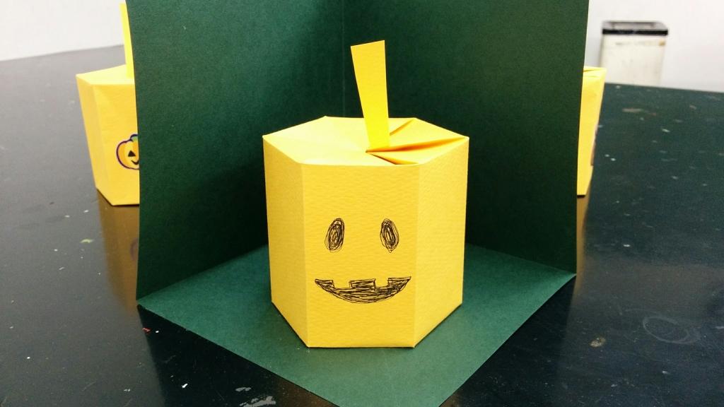 ハロウィンパーティーで、お菓子を入れたら楽しくなりそうな、パンプキンとキャンディーのボックスを作りました。 こちらは、正六角柱の形をいかした「パンプキンボックス」。 株式会社トヨシコーのHPにある、「A4用紙で作る 正六角柱 折り紙」の型紙を使わせていただきました。A4用紙を切り取ったりすることなく、「折る」だけで作れるボックスです。 組み立ての最後のとじ込み方にちょっと苦労しながら、正六角柱が完成!仕上げにヘタを差し込んで、自由に顔や飾りつけをしてもらいました♪ もうひとつ。...