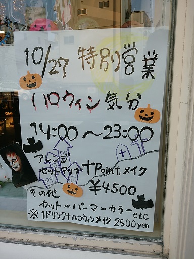 JUGEMテーマ:HALLOWEEN★ あと1週間 AVEC FORCE HAIRのハロウィン営業。 どんな感じ???ってお話がちらほら という事で・・・ 当日は 14時から営業いたします。 14時から17時まではいつも様にお出迎えします。 17時より23時まではハロウィン仕様でお出迎え。 17時からはいつもと違ったメニューをご用意します。 ちょっとしたドリンクメニュー(別途) ちょっとしたおつまみ類 ハロウィンポイントメイクメニュー(¥2000〜) ハロウィンセットアップ&ポイントメイク(¥4500一律) もちろんちょっ...