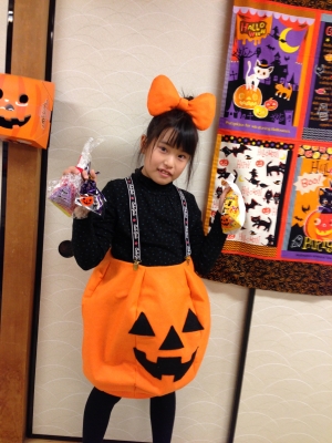 JUGEMテーマ:HALLOWEEN★ 今日は英会話教室のハロウィンパーティでした。 さて、今年の娘の仮装は・・・ わざわざイラストを描いて、 「こんなスカートを作って!」 とのリクエスト。 その絵とは、 (写真に撮っておけばよかったと今、後悔・・・) ジャック・オ・ランタン型スカート。 オレンジで丸いシルエットで黒の顔がついている・・・ と文字で書くととても簡単そうですが! これがなかなかの難物でした! まず、丸くするために、 ビーチボールを参考にして 上下が細くなったオレンジの布を6枚つなぎ、 脱ぎ着...