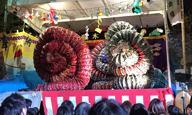 氏神神社の秋祭りに北広島町の春木神楽団が来て舞ってくださいました。私は仕事で最後の演目「八岐大蛇」に何とか間に合いました。春木神楽団の若い舞い手の方々が舞台狭しと飛び回り跳ね回り、アドリブ満載の躍動感あふれる舞に会場もやんやの喝采、大いに沸きました。素戔嗚尊が大蛇を無事退治してさあ十束剣と草薙剣を両手に持って舞おうとすると…さっき退治したはずの大蛇の頭だけかぶった舞い手が次から次へと舞台に飛び出して、スサノオを煽ってどんどん舞う、囃子も調子に乗ってアドリブでどんどん囃す、会場からはワンカップの...