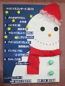 JUGEMテーマ:クリスマス今日は、牛津ルーテルこども園でのクリスマスコンサートでした。今年も先生方が大きなプログラムを作って下さいました。可愛いスノーマン。『ジングルベル』では、私はジングル担当。トナカイも一緒に演奏しました。最後は子供達の手話と一緒にきよしこの夜『』。素敵なお花をありがとう。みんなで記念撮影。お土産にYuming園長手作りのクリスマスクッキーを頂きました。
