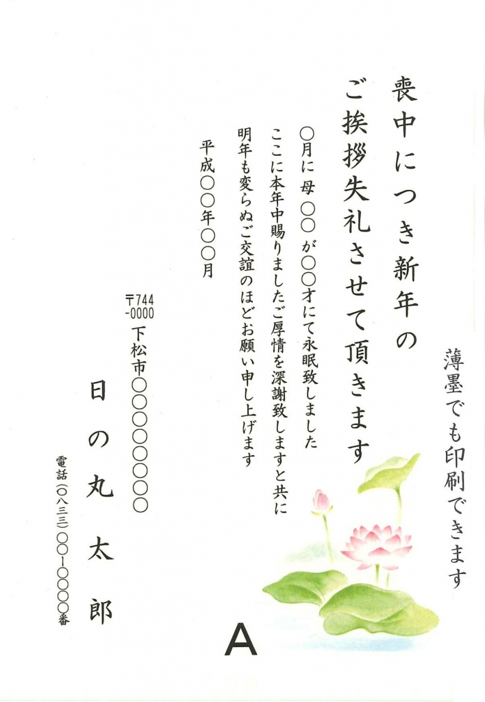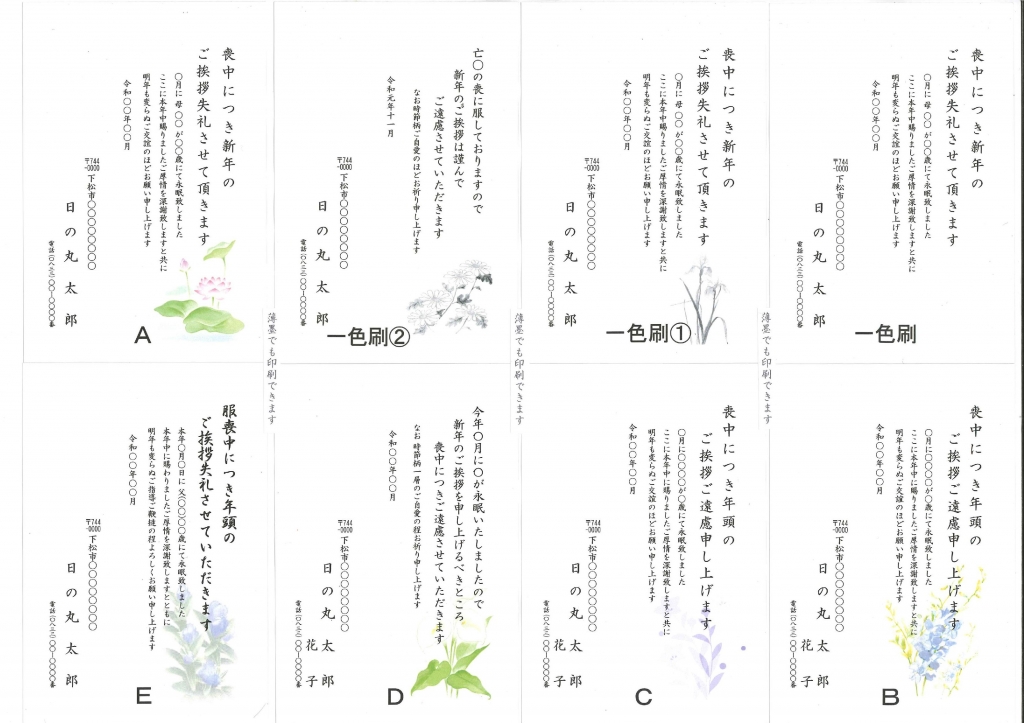 JUGEMテーマ:年賀状企画 ご愛読ありがとうございます。 山口県下松市大手町(下松市役所前) (有)日の丸印室の有田です。 ------------------------------------------------------------------ 年賀状印刷も頑張っていますが、 まずは、お急ぎの印刷といえば、 この時期に「喪中印刷」。 当店では、官製はがきと私製はがき いろいろな種類をご用意しております。 その中での多いものは、 私製ハガキより官製はがきに 絵を刷り込む喪中はがきが人気です。 オーソドックスな蓮か...