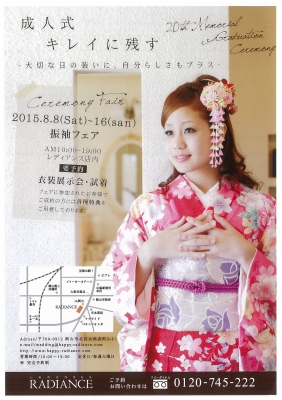 3 JUGEMテーマ:成人式 こんにちは 蒸し暑い日が続きますね。 ついに我が家はエアコンのスイッチを入れてしまいました。 さて、本日は成人式の展示会のご案内です。 8月8日(土)〜16日(日)に 京都の和装専門のメーカー様からお取り寄せをして 展示会をいたします。 反物のものもあり お嬢様のために当店がお仕立てして レンタルをさせて頂きます。 ぜひ、この機会にご覧ください。 また、もうすでにお衣裳のご予約を頂いているお客様には 前撮りのご案内をさせて頂いております。 成人式当日をゆっくりお友達との...