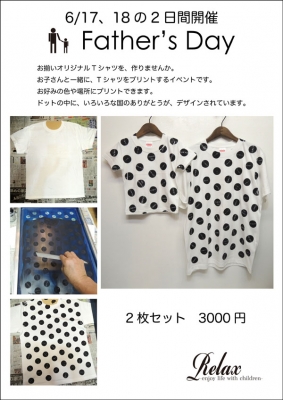 Tシャツをプリントするワークショップイベント 全面プリントできる版をしようして、 Tシャツをプリントしていただけます。 お子さんとお揃いのTシャツをプレゼント。 プリントカラーも、お選び頂けます。 予約を受け付けていますので、 ご希望のサイズなどありましたら、 RELAXまで JUGEMテーマ:父の日