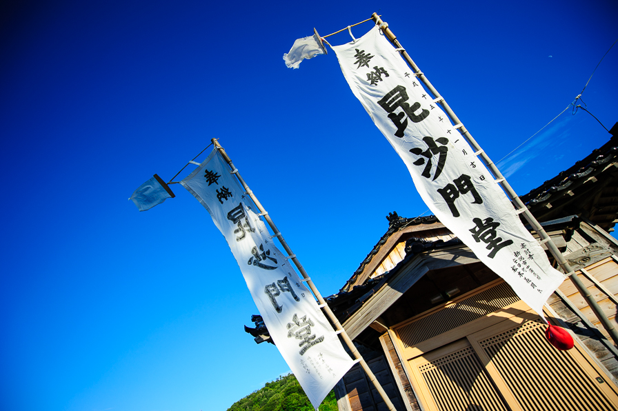 8月22日、岩首の『竹灯りの集い』へ向かう途中、 確か、集落は真木だったと・・・ 風に勢い良くはためく幟旗が見えて、車を止めました。 「祭っちゅう祭じゃねえけどな。念仏をあげるだけ」 近くにいたジイちゃんによれば、翌日23日が祭で、村のもんが集まって念仏をあげるそうです。 「向こうに神社もあるんだ。旧道のとこ。ほら、見えるだろ。」 指差す方には、神社らしい屋根が小さく見えます。 毘沙門堂の念仏のほかに、神社は神社で、また別に祭があるのでしょう。 これから岩首へ行くのだと告げると...