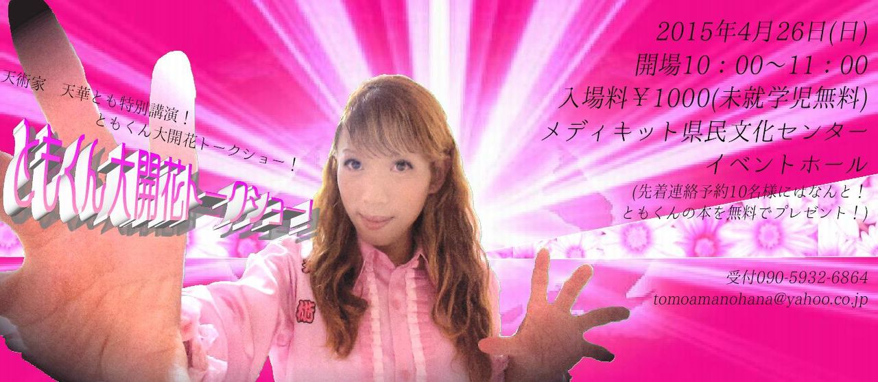 先日お伝えしたともくん大開花トークショーのチケット販売がスタートいたしました〜☆!イベント「新しいこころの時代を大開花させる!」ともくん大開花トークショーinMIYAZAKI!入場はお一人様¥1000!開始は10:00〜11:00までとなっており未就学児のお子さんをお連れの客様はお子様のみに関しては無料となっております!上記の予約にプラスして、メール、お電話などによる先行予約の方には10名様に著書「新しいこころの時代を大開花させる!」を無料配布いたします!(欲しい人は必ず電話してね♪)ほんとうに最高な1...