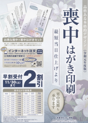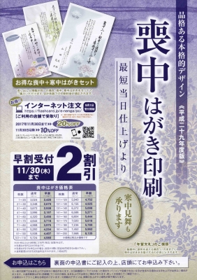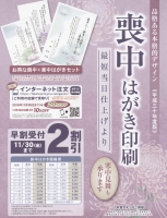 JUGEMテーマ:喪中ハガキ 喪中はがき印刷 受付開始致しました! お世話になったあの方に、 心のこもったご挨拶を 品格のある15種類のデザインと、 あいさつ文4タイプからお選びいただけます。 【早割受付は2割引】 11/30(金)までに お申し込みいただいた方限定です! お早めにどうぞ ※12月1日以降は通常価格にて引き続き受付致します セットでお得!! 喪中+寒中見舞いはがき 同時印刷...