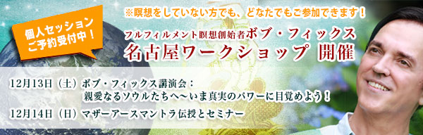BOB FICKES WORKSHOP IN NAGOYA DEC 2014 フルフィルメント瞑想創始者、ボブ・フィックス 名古屋ワークショップ開催、受付開始! 親愛なるソウルたちへ―いま真実のパワーに目覚めよう! 来る12月12日(金)から16日(火)まで、フルフィルメント瞑想創始者であるボブ・フィクスが名古屋へやって来ます。瞑想にご興味のある方、マザーアース(地球)を癒し、自分自身に真の『気づき』を求めておられる方はぜひご参加ください。 あなたにとって、必ずや素晴らしい体験となることでしょう。 フルフィルメント瞑想を習...