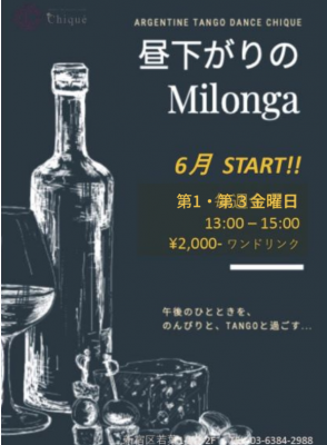 現在、チケは、土日にミロンガを開催しています。 更に今月(6月)からは、 第1、3金曜昼間もミロンガを開催❣ 13:00-15:00 2000円(ワンドリンク付) DJ:Natsu MacMariが担当でいつもいるのは、土曜日です。 18:30-21:00 2500円(ワンドリンク付) DJ: Roberto いやぁ、昨日のミロンガ、楽しかったですっ、スタッフなのに、思い切り楽しんでいました笑 ミロンガが楽しめるかは、音楽によ...