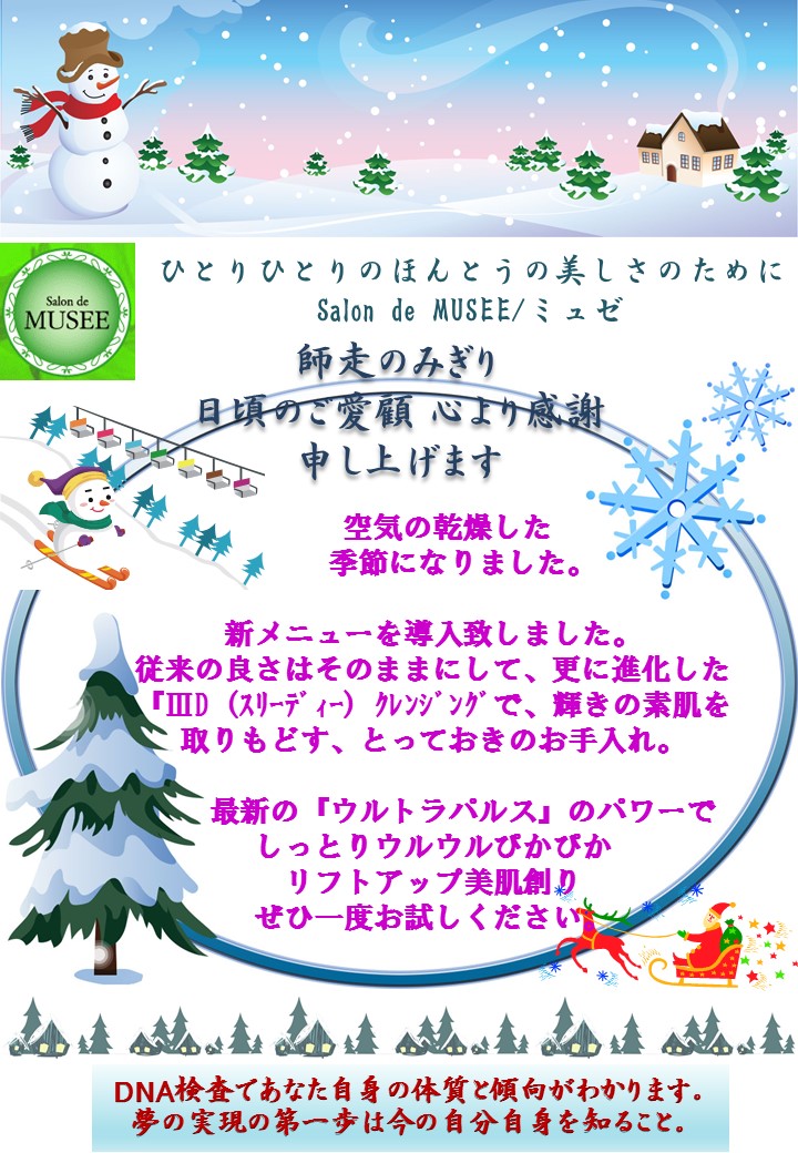 JUGEMテーマ:お知らせ いつも豊橋エステ『サロン・ド・ミュゼ』を御利用頂きありがとうございます。 2015年もあとわずか。一年間ご愛顧頂きありがとうございます。