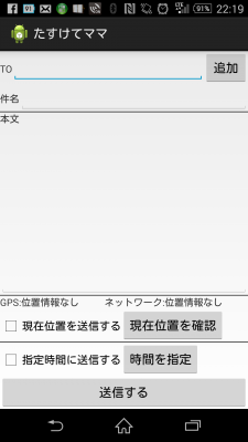 JUGEMテーマ:Android Androidアプリ 「時限式位置通知ツール」公開しました https://play.google.com/store/apps/details?id=com.thegifumap.android.tasuketemama ヘルプはこちらです http://thegifumap.com/help/timed_position_notification_tool.php