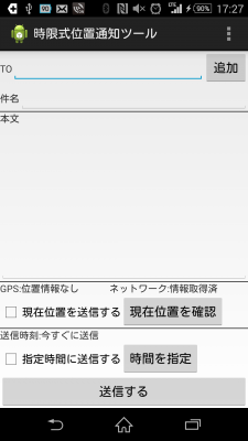 JUGEMテーマ:Android Androidアプリ「時限式位置通知ツール」の開発状況です。 指定時間にメールを送信する機能を追加しました。 まだ、色々テストとか、ドキュメント整備とかありますが、一通りゴールしました。 ダウンロードはこちらから http://thegifumap.com/programing_world.php
