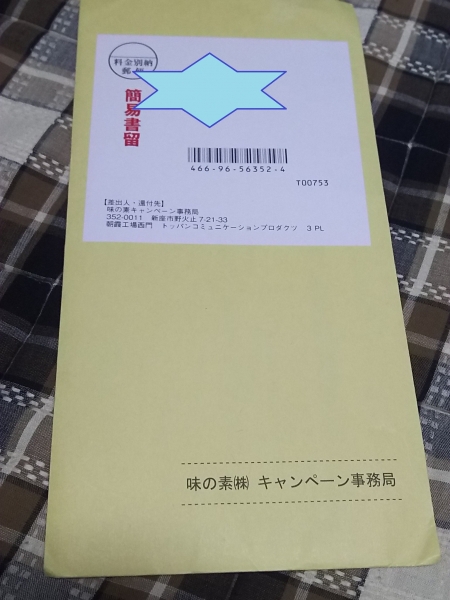 テーマ:懸賞、プレゼント どうも☆ 今回は当たった時にしか書けない 懸賞記事! とある封筒が我が家に届きました。 味の素? キャンペーン事務局!? あれ、何に応募したたんだろ??? ちょっと思い出せないまま ひとまず封筒をオープン! うおーーーー! ...