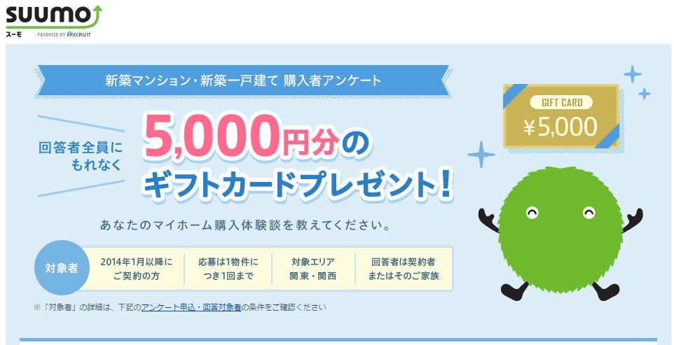 JUGEMテーマ:懸賞、プレゼント 新築マンションや新築一戸建てを購入した人にはウレシイお知らせです! ただ今、suumoさんがアンケートを実施しています。その報酬がなんと5,000円分のギフトカード♪ お申し込みはこちらをクリック↓ 期間限定です。 ★回答者全員に5000円★新築マンション・新築一戸建て購入者アンケート★ 2014年1月以降、首都圏・関西にて新築マンションを購入された方! ■■■■回答者全員に5000円!!■■■■ でも、なんだか話しが良すぎてコワイですよね。 そこで、アンケートの目的を...