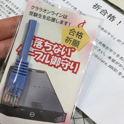本日、クララオンラインさんから TWITTER 合格祈願企画 #ツイ拝 「特製ケーブル合格お守り」 "落ちない"ケーブル御守り 届きました〜
