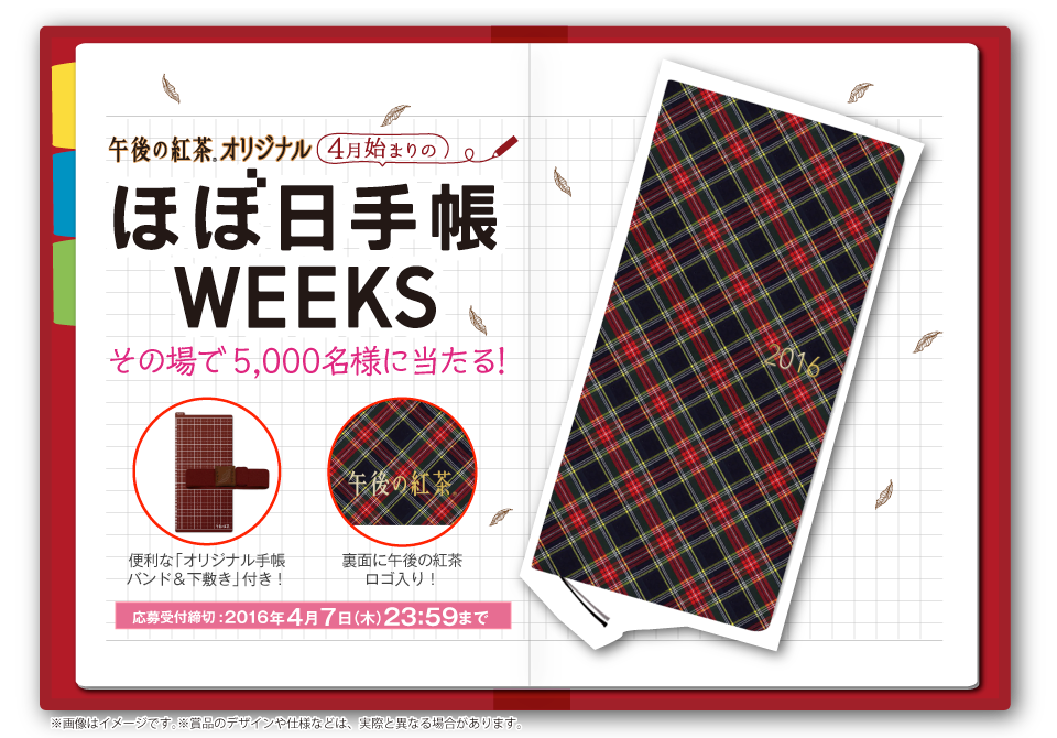 午後の紅茶オリジナル 4月始まりの ほぼ日手帳WEEKS ただいまキャンペーン中 http://mutou.gogotea.jp/#_ga=1.180215840.50247055.1455725427より画像引用 いいなーかわいいなー ほぼ日の手帳、昔カズンを使ってたなー 調べたら2009年だった そんなに前だったかぁ カズンの大きさは大好きだったんだけど何気に空白が目立つようになり、、、 使い切れずにもったいないことになった覚えが… WEEKSなら使い切れそう…! 無糖紅茶も好きだからちょいとチャレンジしてみようかなー こういうの、...