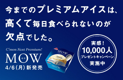 森永乳業のアイス「MOW」の実感!プレゼントキャンペーンに応募しました。 ■ MOW実感!10,000人プレゼントキャンペーン 【賞品】MOW6個入りプレミアムボックス 【当選者数】合計10,000名(毎週1,000人×10週) 【応募締切】2015年6月2日(火)17時 【提供】森永乳業 MOWは今日、4月6日に大幅リニューアルして新しくなったそうです! そのMOWが当たります 以前、この時にMOWの懸賞に当選したことがあったんですけど、 『素材本来の旨みと乳のコクが味わえる、やさしい口どけとすっきりした後味のア...