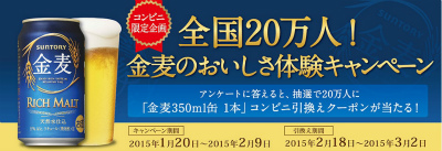 サントリー金麦のキャンペーンに応募しました コンビニ限定企画 全国20万人!金麦のおいしさ体験キャンペーン 【賞品】サントリー金麦 350ml缶 1本 無料引換え券 【当選者数】20万名 【応募締切日】2015年2月9日(月)23:59 【提供】サントリー ※20歳以上の方に限ります。 ※当選者には、2015年2月18日(水)にサントリーキャンペーン事務局より当選メールあり。 アンケートに回答して応募すると抽選で20万名に、コンビニエンスストア店頭で サントリー金麦 350ml缶1本と引換えられる「無...