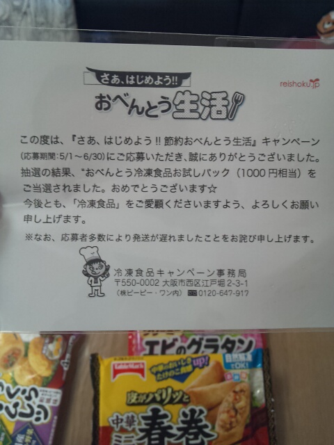 JUGEMテーマ:懸賞、プレゼント こんにちは。たにけです。 突然のピーポーン。冷凍の何かが届いたんですね。 だれもなんも買ってへんで〜。いや、誰かなんか注文 したんちゃーん。 受領印押しと、「ごくろーさんです〜」 なにやら怪しげなシルバーの保冷バッグ。 さっそく開けてみましょう! レッツオープン! 懸賞やん!これ!何ヶ月前の応募?? 1000円相当! いいじゃないですか!久しぶりですね。 前回の当選品は、福島のお米5キロだったかな。 はい...